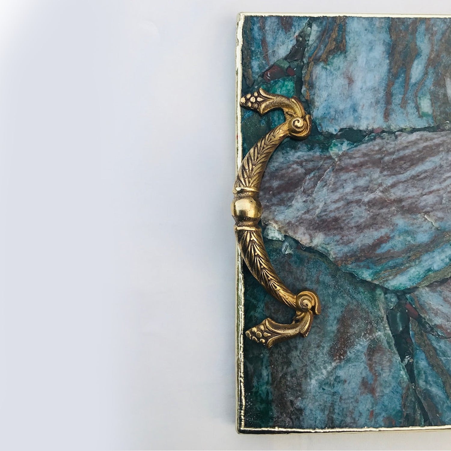 The natural look of agate stone creates a unique abstract pattern on this serving board. The tray is ideal for serving cheese or a fruit course.